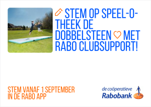 Wij doen mee aan Raboclubsupport. Met de opbrengst willen we ons buitenspeelgoed vernieuwen en uitbreiden. Door op ons te stemmen kunnen wij duurzaam buitenspeelgoed aanschaffen, zoals een water- en zandtafel, een tafeltennistafel, een skelter, graafmachines, kiepwagens, een airtrack gymnastiekbaan, een pikler-driehoek, quadro zelfbouw klimtoestellen etc.
