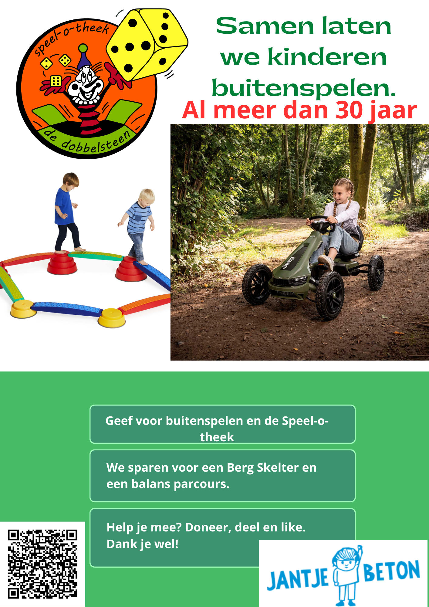 In maart houden we een online collecte voor Jantje Beton. Net als zij vinden wij buitenspelen heel belangrijk. Dus dat steunen we. Daarbij is 50% van de opbrengst van de collecte voor de Speel-o-theek. We sparen voor een mooie Berg skelter en een balansparcours. Wil je alleen de Speel-o-theek de Dobbelsteen steunen, doe dan een…